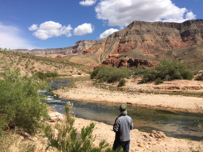 The Virgin River Gorge is on I-15 on a sliver of Arizona in between Utah and Nevada. It is spectacular. The river is quite low. In a normal year, where my brother-in-law is standing would be under water in April and fording it would be difficult if not impossible.